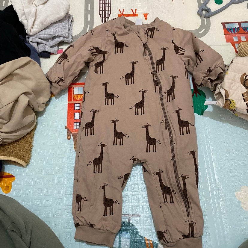 Kahverengi fermuarlı, uzun kollu, yüksek yakalı erkek bebek tulumu, zürafa desenli, yumuşak ve sıcak kumaştan yapılmıştır.