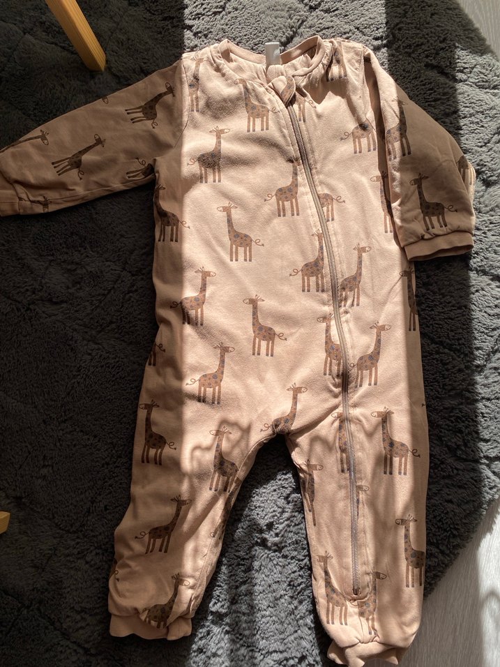 Kahverengi, fermuarlı erkek bebek tulumu, yumuşak ve sıcak kumaştan. Zürafa desenlidir, sokak stili için uygun.