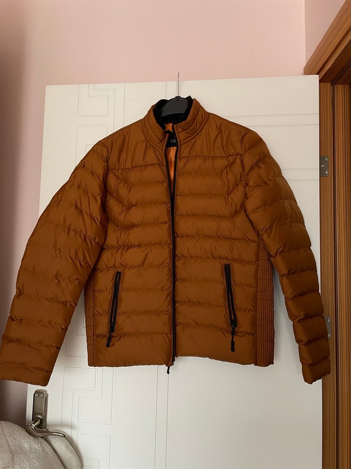 Kahverengi şişme erkek mont, fermuarlı ön ve uzun kolludur. Dış mekan kullanımı için yumuşak dolgulu malzemeden yapılmıştır, sade ve dar kesimdir.
