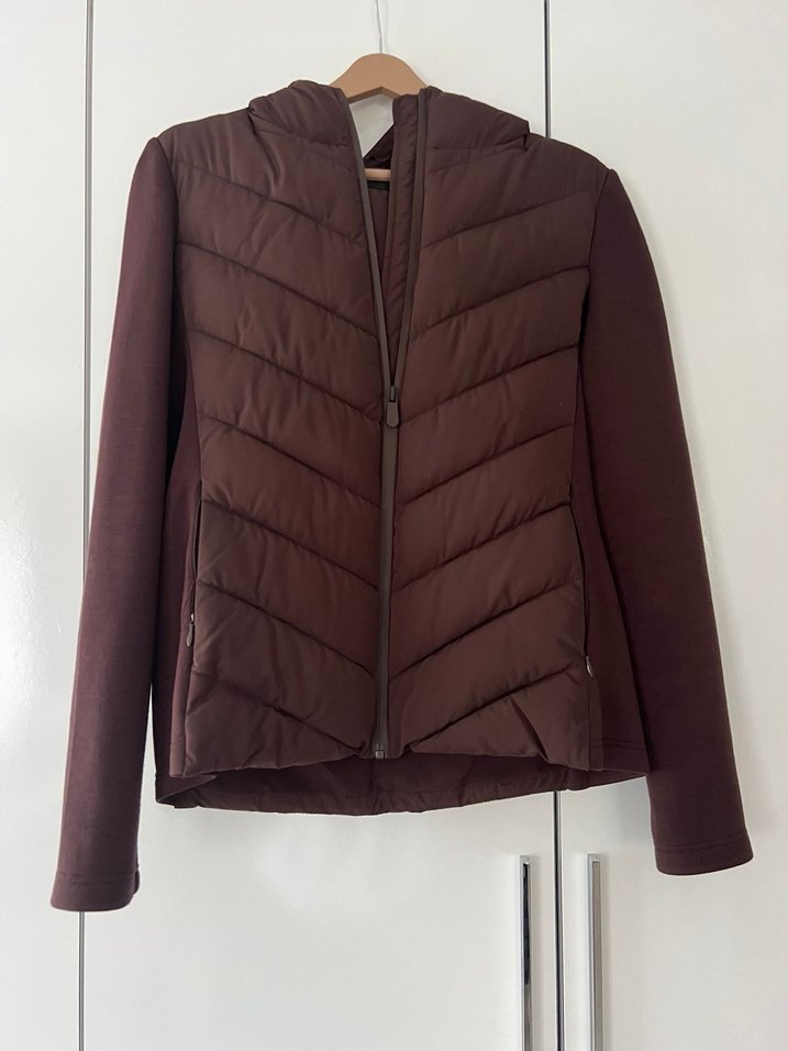 Fermuarlı, yüksek yakalı ve uzun kollu, kahverengi, vücuda oturan kadın ceket. Orta boy uzunlukta, desensiz ve yumuşak, sıcak kumaştan üretilmiştir.