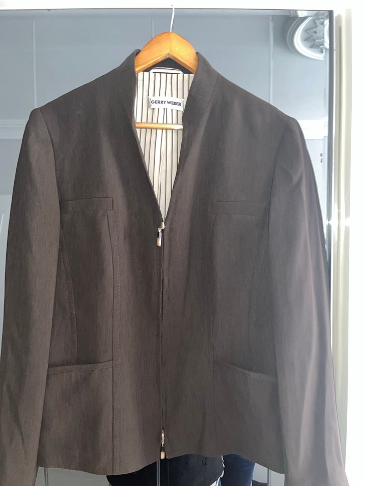 Kahverengi kumaştan, fermuarlı, uzun kollu kadın ceket. Normal kesim ve notched lapel yakaya sahip, ofis için uygun sade tasarım.