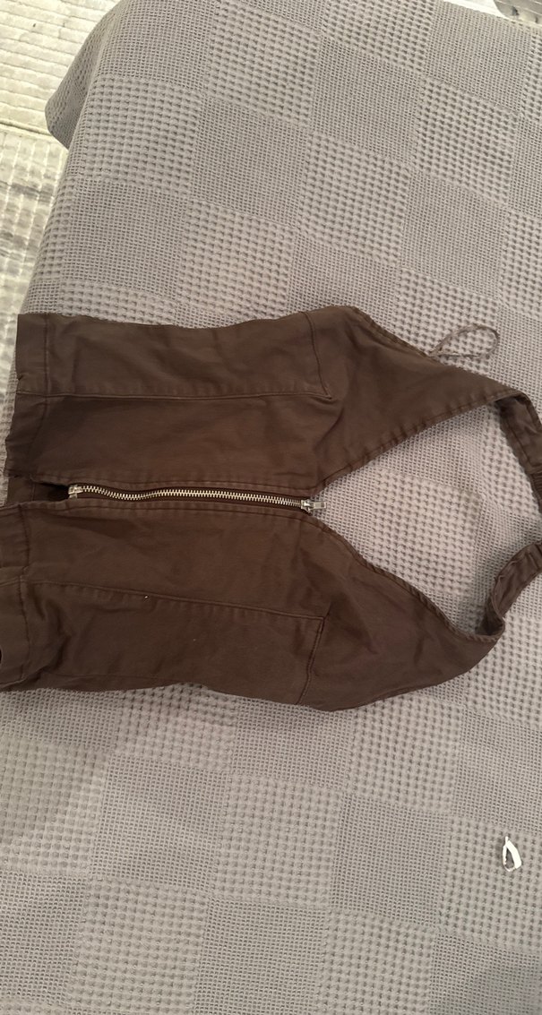 Kahverengi, fermuarlı, kolsuz ve halter yakalı kadın yeleği. Sentetik kumaştan, vücuda oturan ve midi boyda, dış mekan günlük kullanıma uygun.