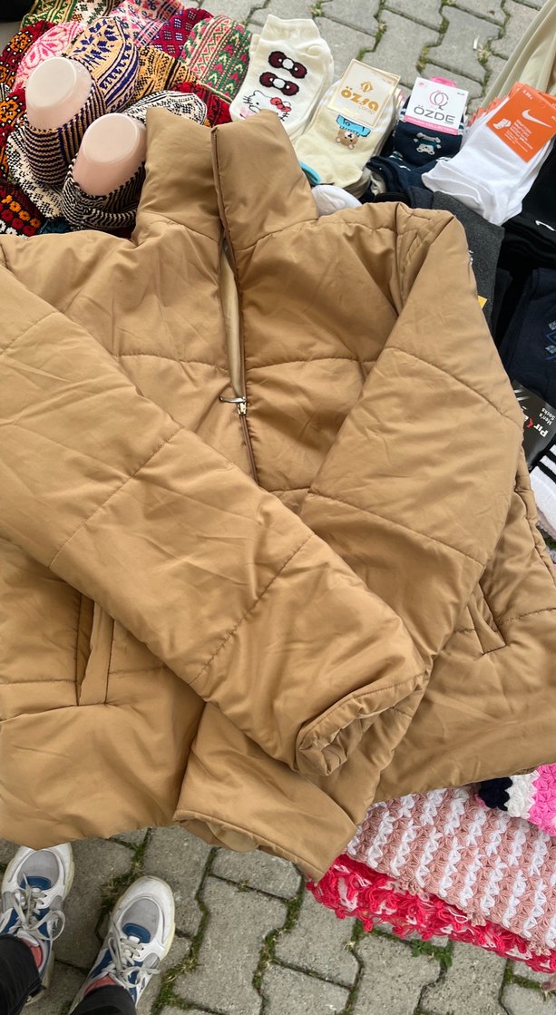 Kahverengi, fermuarlı, yüksek yakalı kadın kışlık ceket, sokak stili ve midi boyda, yumuşak sentetik kumaştan, günlük rahat kullanım için uygundur. M L bedene uygun 3 4 kere giyildi