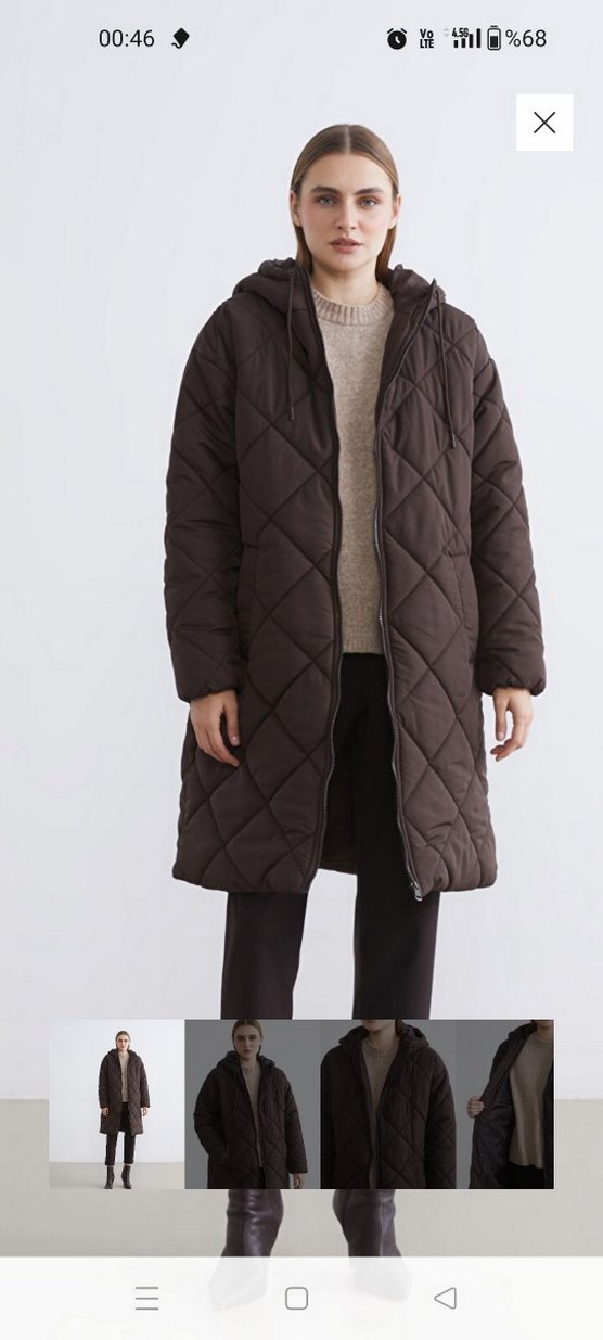 Kahverengi, parlak, kapitone kumaştan yapılmış, fermuarlı ve kapüşonlu kadın montu. Günlük kullanıma uygun, normal boyda ve vücuda oturan kesime sahiptir. Rahat ve sıcak tutar.
