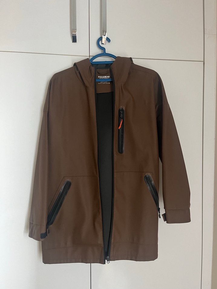 kahverengi yağmurluk, regular fit kesim ve kapüşonlu yaka ile. Uzun kollu, fermuarlı, günlük kullanım için uygundur. Unisex olarak kullanılabilir