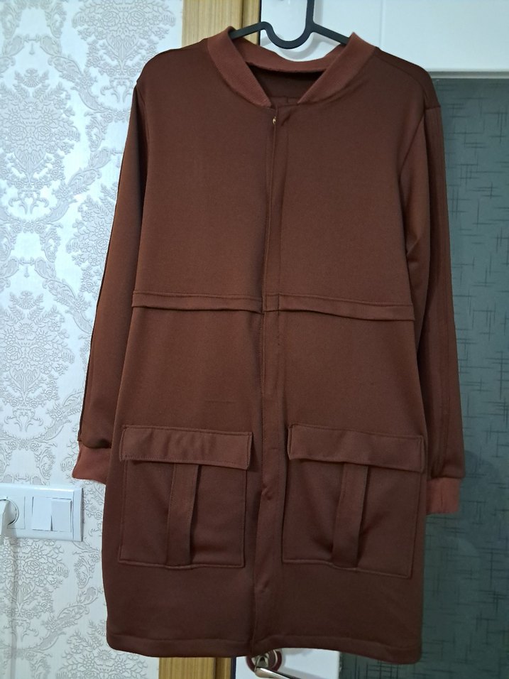 Kahverengi, uzun kollu, bol kesim ceket. iki büyük ön cepli, yumuşak ve oysho kumaştan yapılmıştır. Günlük kullanıma uygundur.
