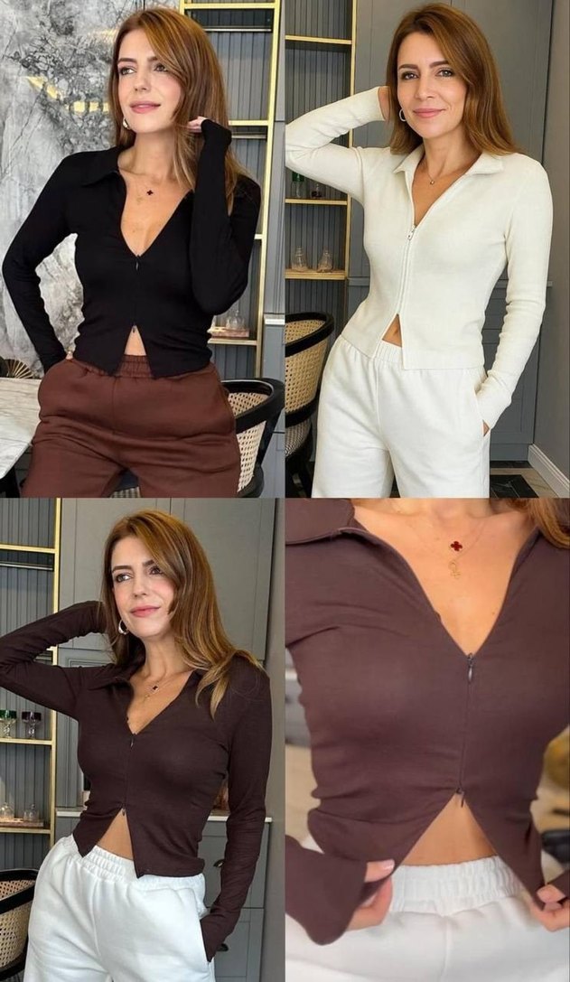 Dar kesim, uzun kollu, V yakalı ve fermuarlı kısa kahverengi kadın bluz. Günlük kullanıma uygun, sentetik yumuşak kumaştan üretilmiştir. ✨ Kahverengi, Siyah ve Beyaz renk mevcuttur.