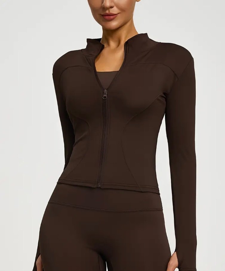Kahverengi, yüksek yakalı ve fermuarlı uzun kollu, sentetik kumaştan yapılmış dar kesim spor üst. Oysho muadili