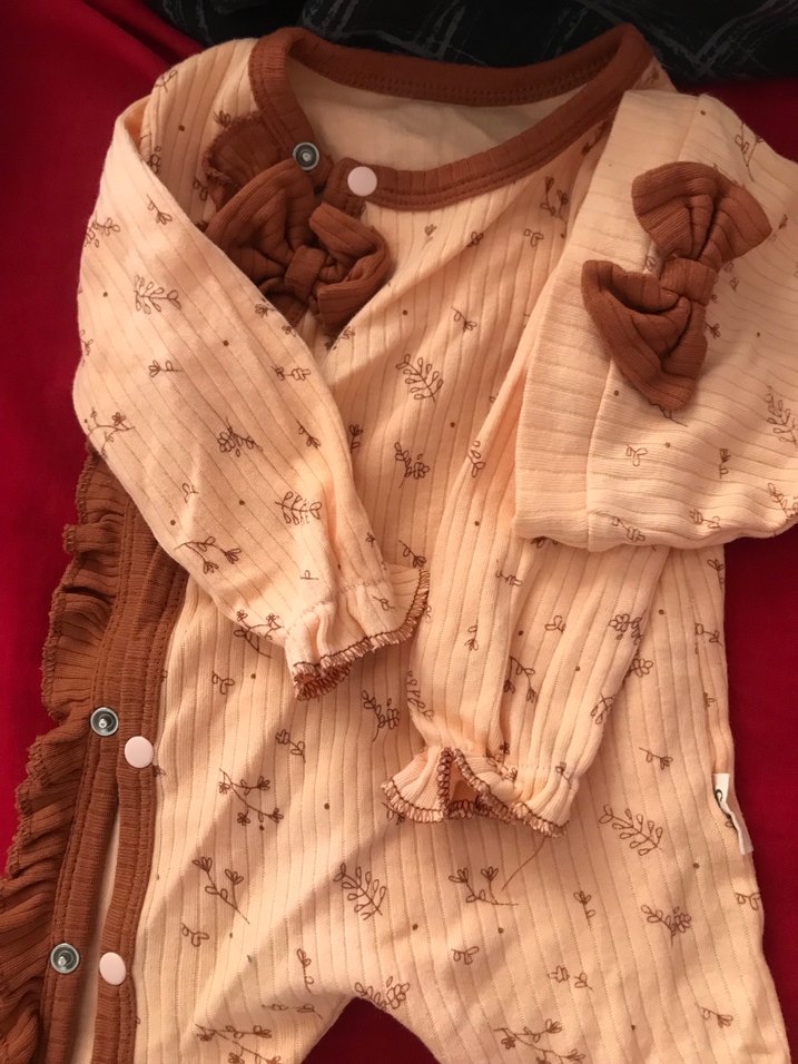 Pastel kahverengi, fırfırlı ve ince çiçek desenli bebek tulumu. Kolay giydirme için çıtçıtlı, yumuşak kumaşlı. 9 12 ay yazıyor ancak kalıp küçük 6 ay gibi