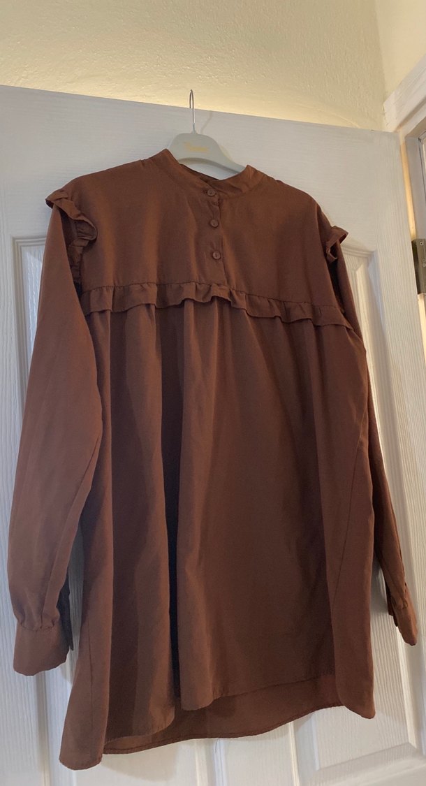 Kahverengi renkli, uzun kollu ve yüksek yakalı hamile bluzu. Yumuşak keten kumaştan, bol kesim ve midi boyda, fırfır detaylıdır.