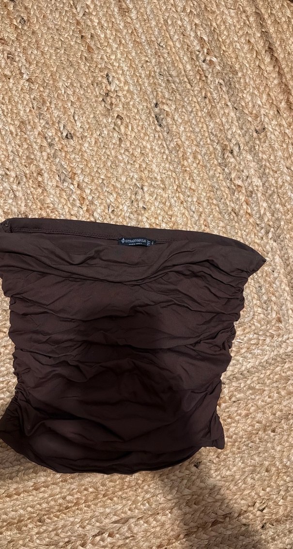 Kahverengi, fırfırlı, straplez ve fitted kesim kadın puf yelek. Keten kumaştan üretilmiş, günlük kullanıma uygun rahat ve şık bir modeldir.