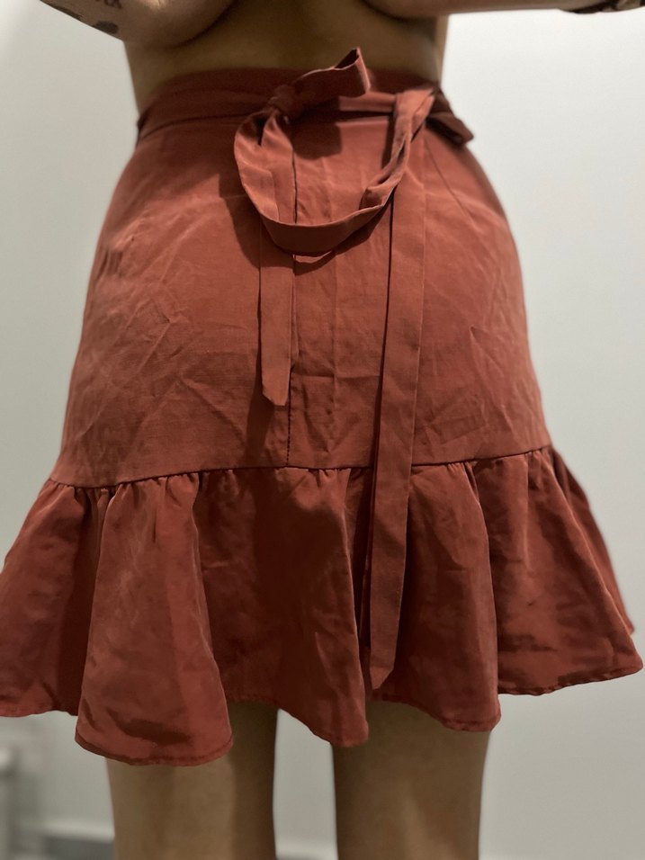 Yumuşak keten kumaştan, bol kesim kahverengi midi etek. Fırfırlı etek ucu ve parlak dokusuyla bohem tarzı yansıtıyor.