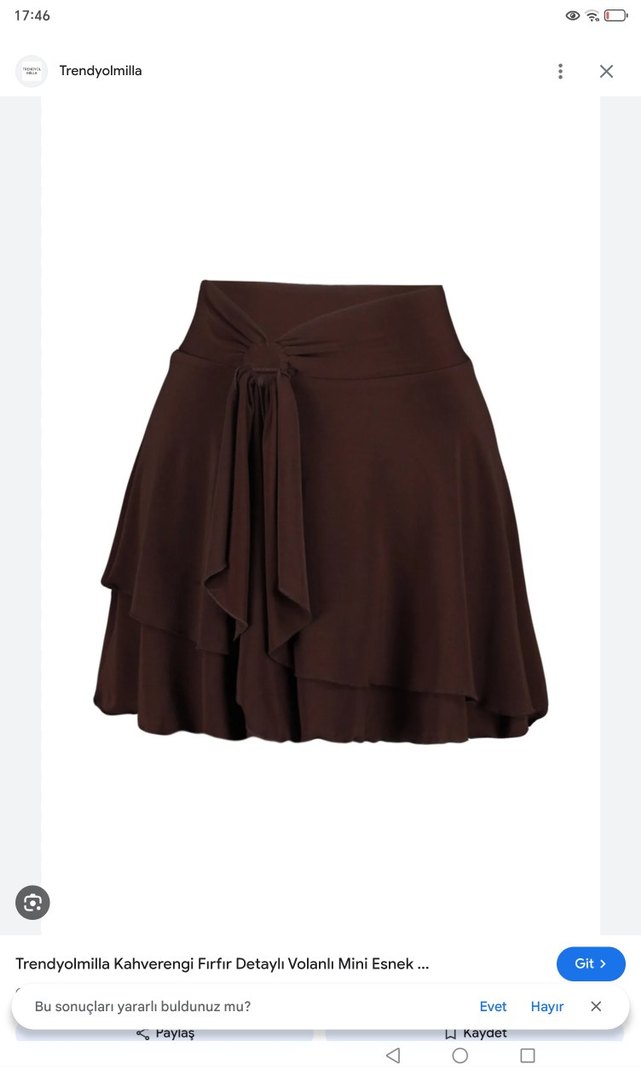 Kahverengi, fırfırlı detaylı, bol kesim ve satenimsi dokuda kısa mini etek, romantik akşamlar için uygundur. L-xl olur gibi