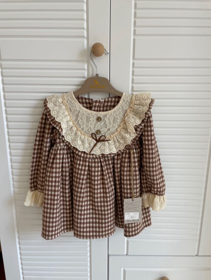 Kahverengi, bol kesim kız elbisesi uzun kollu ve yuvarlak yakalıdır. Nakışlı fırfır detayları ve dantel süslemeleriyle vintage görünümdedir. MARKA TEMSİLİDİR