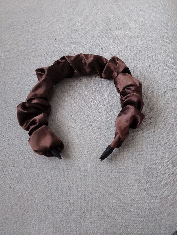 Kahverengi saten kumaştan yapılmış, fırfırlı detaylara sahip saç bandı, gotik ve avant-garde tarzlar için uygun. ✨