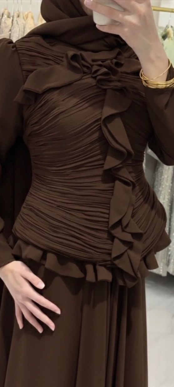 Kahverengi, yüksek yakalı ve uzun kollu, vücuda oturan uzun abiye elbise. Ön ve etek uçlarında fırfır detayları bulunur kiralık @l.rentdress Instagram üzerinden randevu oluşturabilirsiniz