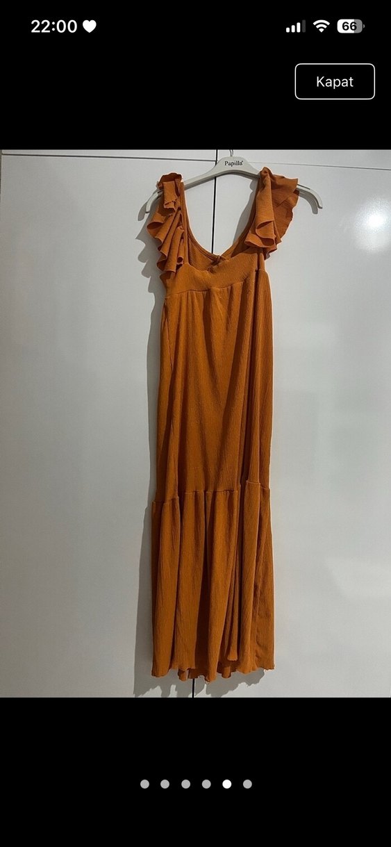 Kahverengi keten elbise, bol kesim, fırfır detaylı ve V yakalıdır. Kolsuz ve parlak bir görünüme sahiptir, bohem tarzı yansıtır.