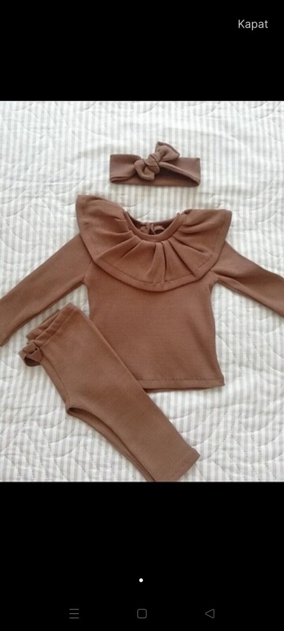 Kahverengi uzun kollu fırfırlı yakalı üst, uyumlu pantolon saç bandından oluşan bebek kız takımı. Düz ve yumuşak dokulu. yenidoğan takımları 250tl. #yenidogantakim