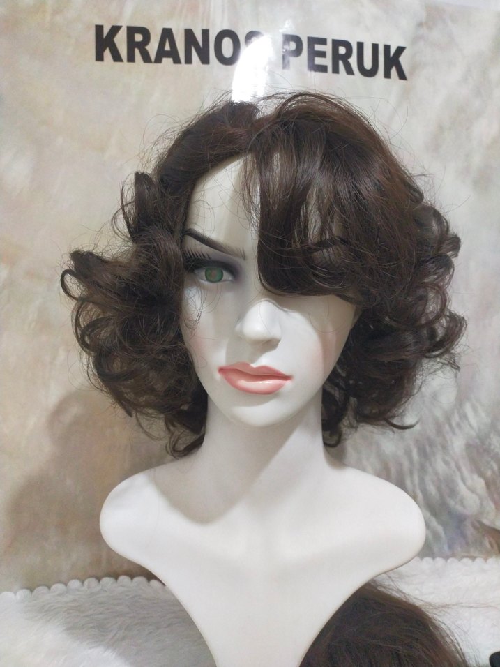 Koyu kahverengi sentetik kumaştan, fırfırlı buklelerle vintage tarzda peruk. Avant-garde ve moda trendlerine uygun. Marka: KRANOPERUK. sağ sol ayrımı yapılır İpek taban gibi gibi ama