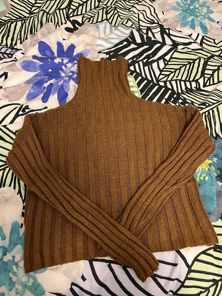 Kahverengi, fitilli ve boğazlı uzun kollu kadın kazak. Yumuşak örme kumaştan, normal boyda, rahat kullanıma uygun.