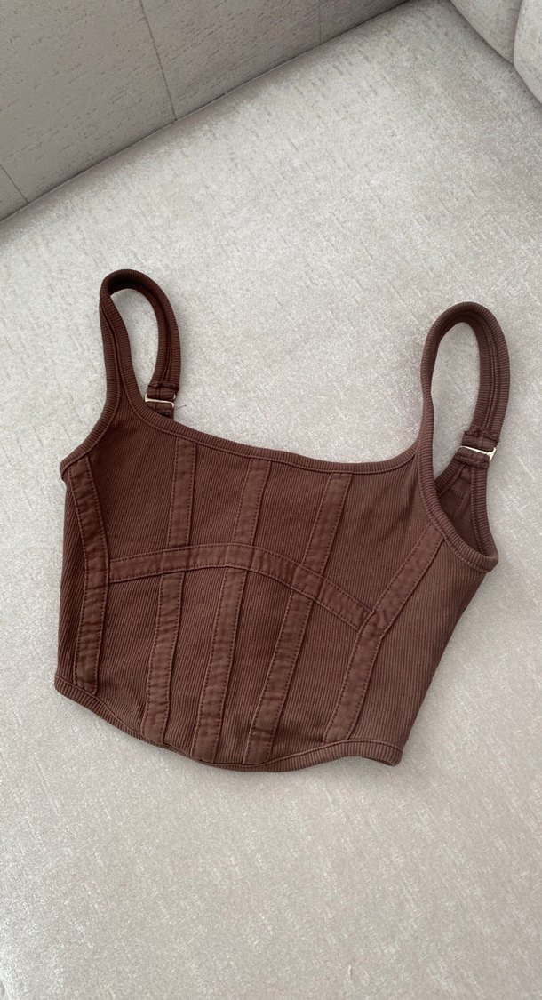 Kahverengi, fitilli, midi uzunlukta ve desensiz hemşire korsesi. Destek sağlayan dikiş detayları ve ayarlanabilir askılar bulunur.