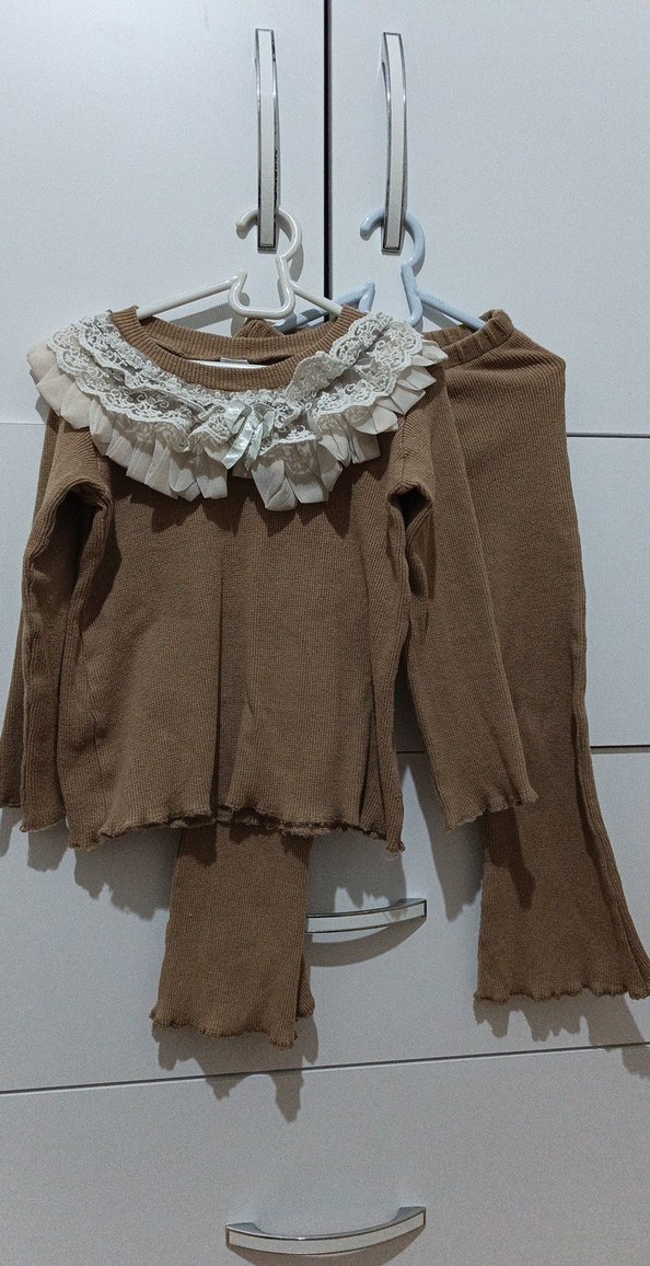 Kahverengi fitilli kız çocuk takımı, uzun kollu üstü beyaz fırfırlı yakaya sahip, rahat pantolon ile tamamlanmıştır. Yumuşak ve konforludur.
