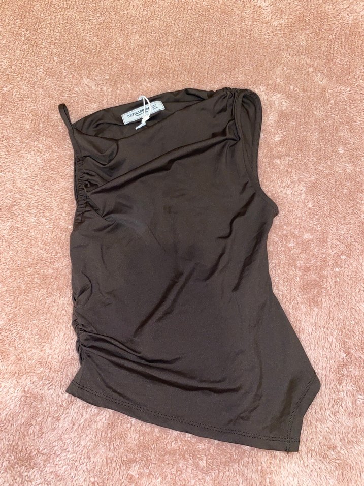 Fitted kesim, kolsuz, kayık yaka kahverengi bluz . Normal midi boyda, desensiz tasarım.