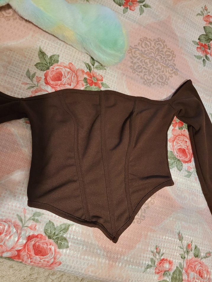 Koyu kahverengi, fitted kesim ve midi boyda korsesi. Düz ve desen içermeyen kumaşıyla destek sağlar.