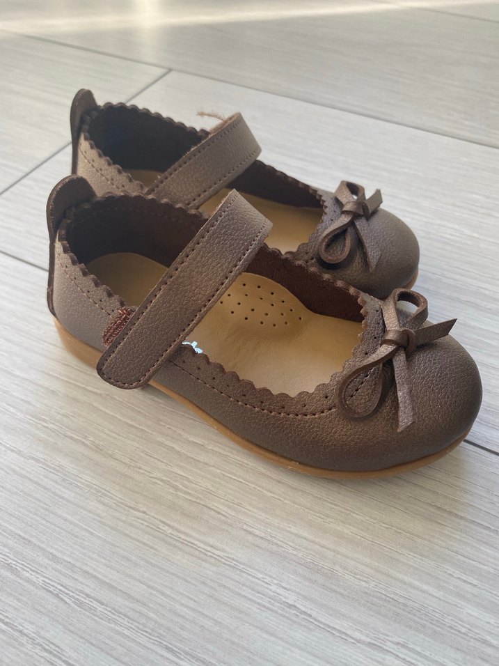 Kahverengi, fiyonk detaylı kız babeti, yumuşak kauçuk tabanlı ve klasik sade tasarımlı.