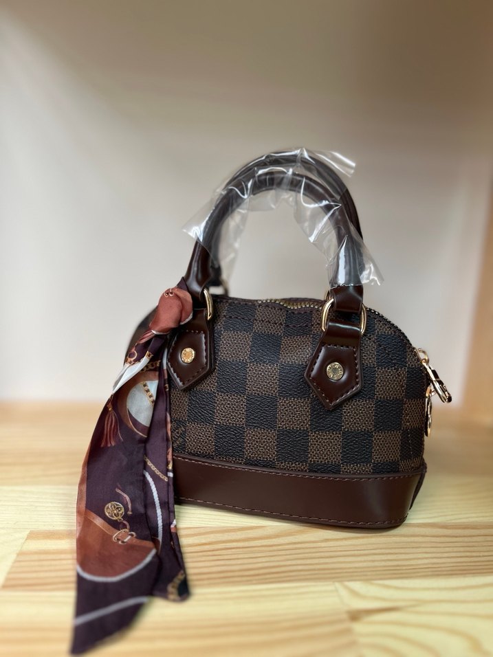 Kahverengi kareli deri, kemerli saplar ve dekoratif fularlı modern klasik çanta, günlük kullanıma uygun şık bir seçenek.