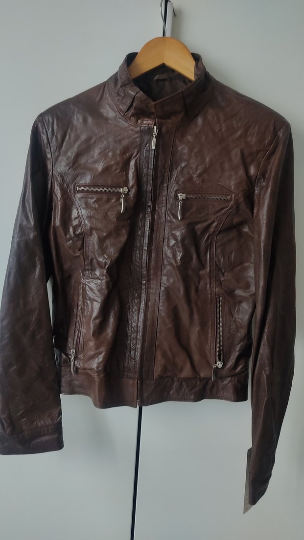 Bu kahverengi gerçek deri biker ceket, fermuarlı cepler ve keskin yaka detayıyla trend sokak stiline uygun şık ve dar kesimdir. Uzun kollu ve midi boydadır. S-M beden için uygundur, hiç kullanılmamıştır, görülen kırışıklıklar derinin kendi özelliginden kaynaklıdır, etiket üzerinde de deri cinsi kahve kırış şeklinde işlenmiştir, etiket üzerinde bulunan beden bilgisi yanıltıcı olabilir, bedeni daha küçüktür