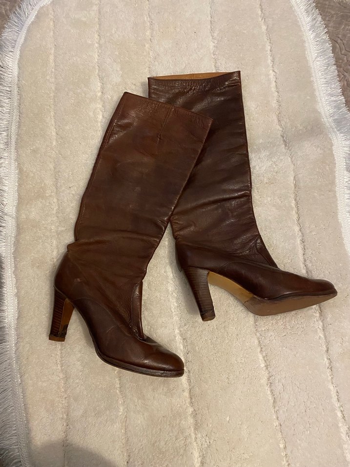 Kahverengi deri, stiletto topuklu, tokalı vintage tarzı dizaltı çizme, günlük kullanım için uygundur. Gerçek deridir. 36 beden ayaklar için uygundur.