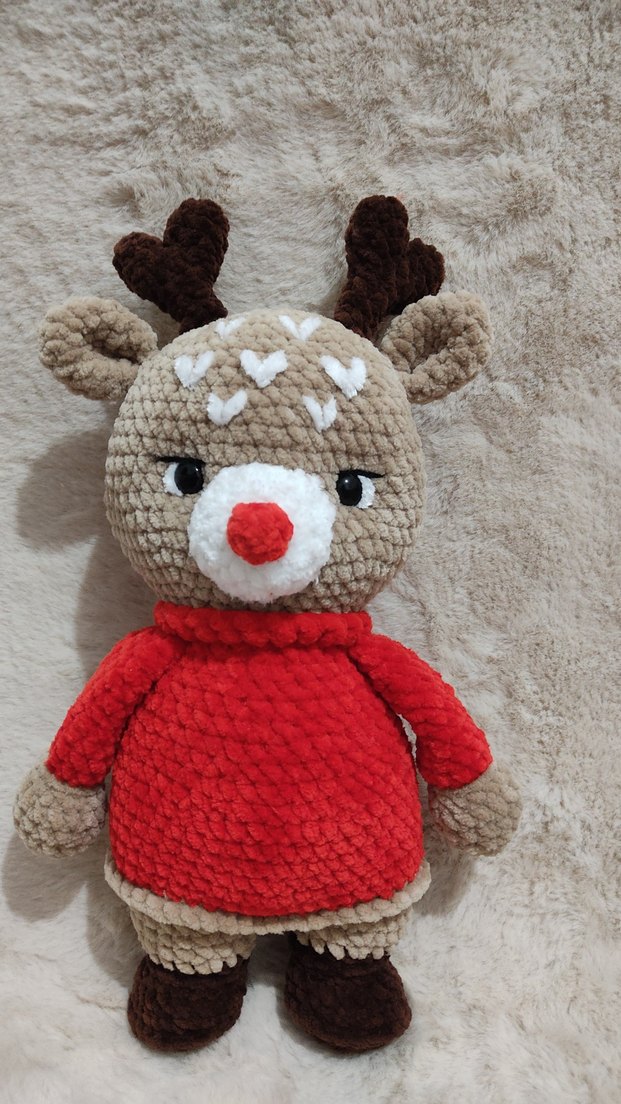 Kahverengi peluş geyik oyuncak, kırmızı kazak giymiş ve kafasında beyaz kalp desenleri var. Koyu kahverengi boynuzları ve kırmızı burnu bulunur. boyu 35 cm