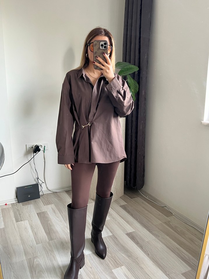 Kahverengi pamuklu gömlek, yakalı, uzun kollu ve bel detayıyla trend bir görünüm sunar. Normal kesim ve midi boyda, günlük kullanıma uygundur.