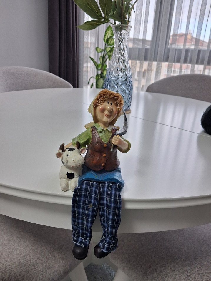 Kahverengi yelek, yeşil gömlek ve mavi ekose pantolon giymiş, küçük beyaz bir inek tutan figürin, beyaz masada oturuyor.