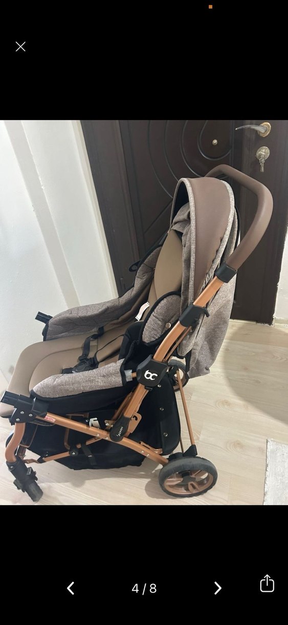 Kahverengi ve gri renklerde bebek arabası, rahat oturma yeri ve sağlam iskelet yapısına sahiptir. Emniyet kemerleri ve alt kısmında saklama sepeti bulunur.