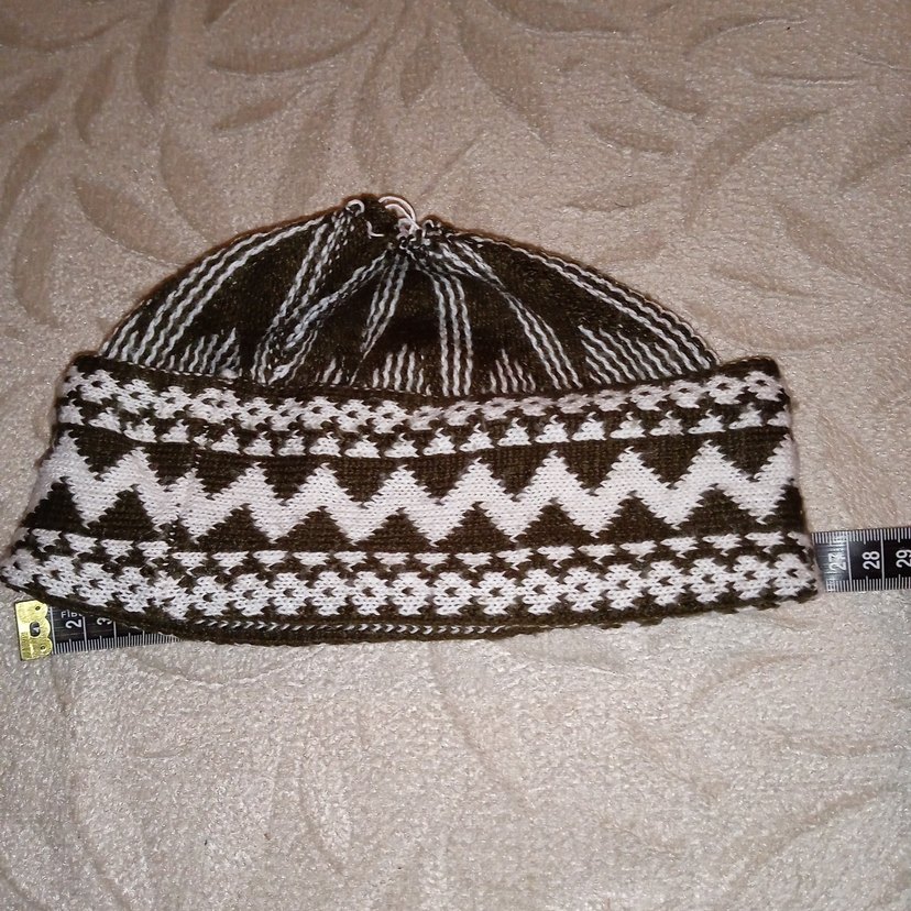 Kahverengi ve gri renklerde, retro zikzak desenli, rahat dokuma kumaştan erkek bere. Çeşitli ürünler için diğer ilanlarıma da bakınız.