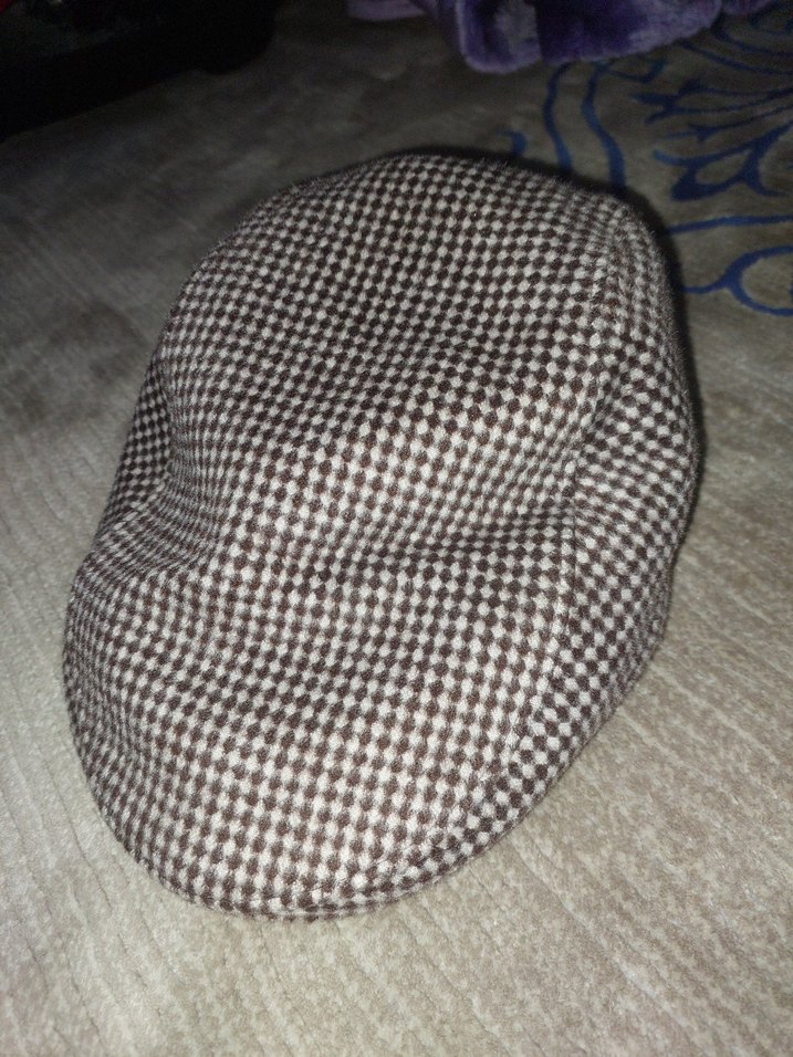 Kahverengi ve gri desenli, rahat dokusuyla erkeksi ve eski tarzı yansıtan bir şapka.