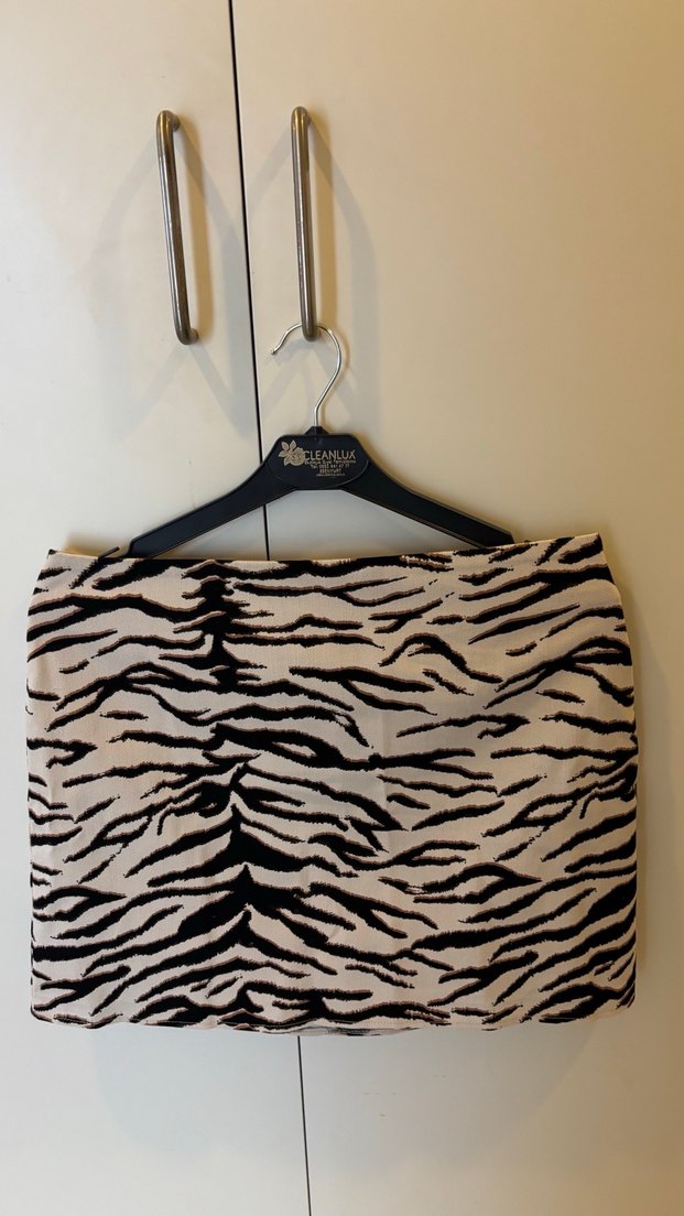 Kahverengi ve gri zebra desenli mini etek, rahat kumaştan yapılmış ve şık bir görünüm sunar.