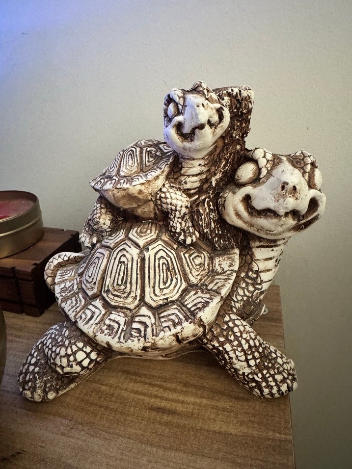 Kahverengi ve gri renklerde, detaylı kabuk desenlerine sahip iki kaplumbağa figürü, rustik ve şirin bir tasarıma sahiptir.