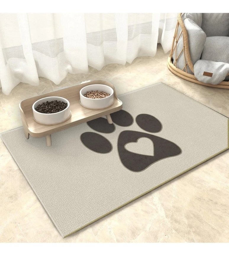 Kahverengi ve gri tonlarında, büyük patili desenli ve yükseltilmiş mama kapları içeren evcil hayvan beslenme altlığı.