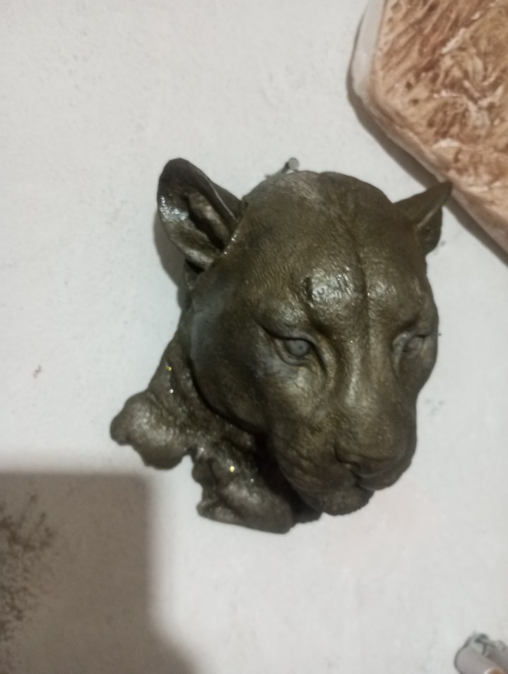 Kahverengi ve gri tonlarında, detaylı puma başı figürü. Yüzey dokusu belirgindir. Duvara asıla bilir.