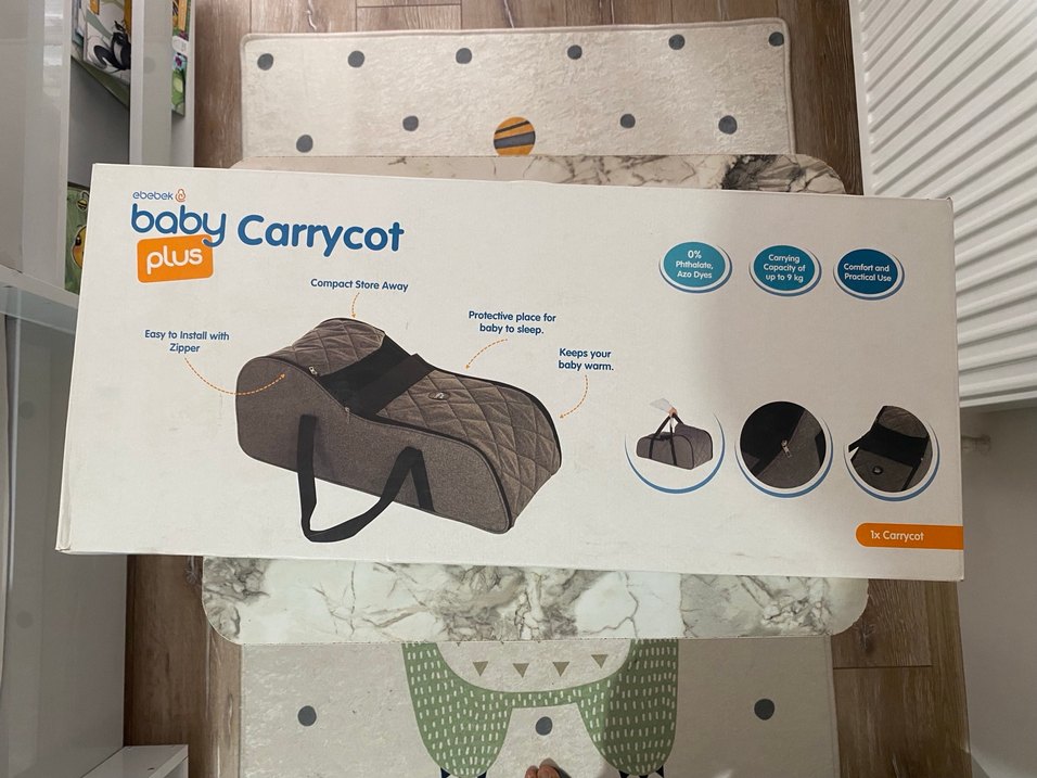 Kahverengi ve gri taşıma sepeti, bebeğin uyuması için koruyucu alan sağlar ve sıcak tutar. 9 kg'a kadar kullanıma uygundur. Kompakt saklama ve kolay taşıma kulpları bulunur.