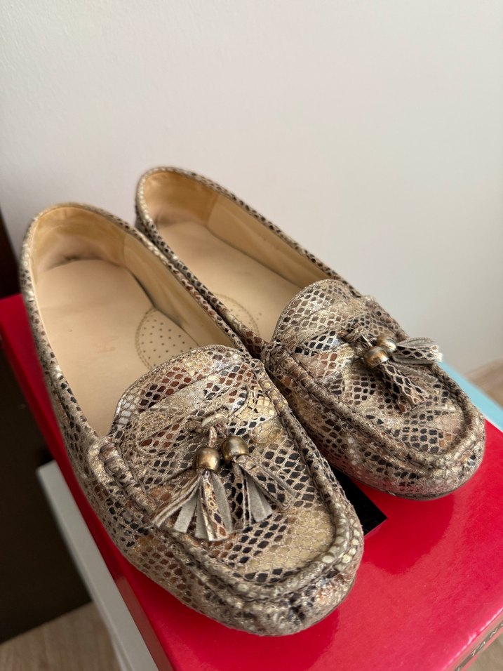 Kahverengi ve gri yılan desenli deri babet, dolgu topuk ve püskül detaylı. Günlük kullanıma uygun klasik stil.