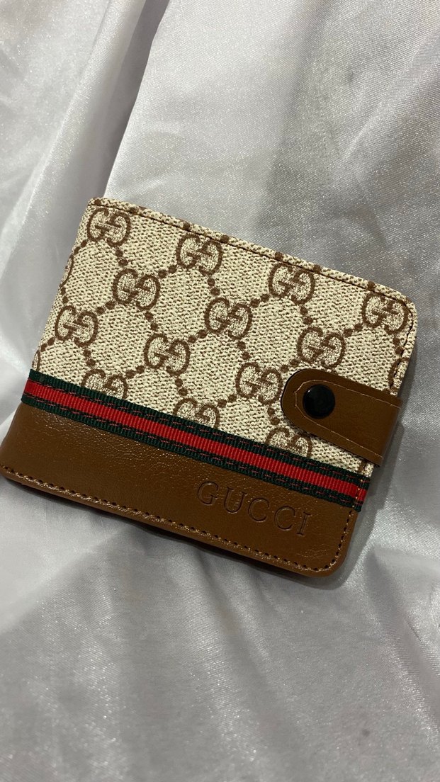 Kahverengi erkek cüzdanı, Gucci desenli baskı ve çıtçıtlı kapama özelliği taşır. Klasik tarzda, streetwear dokunuşlu.