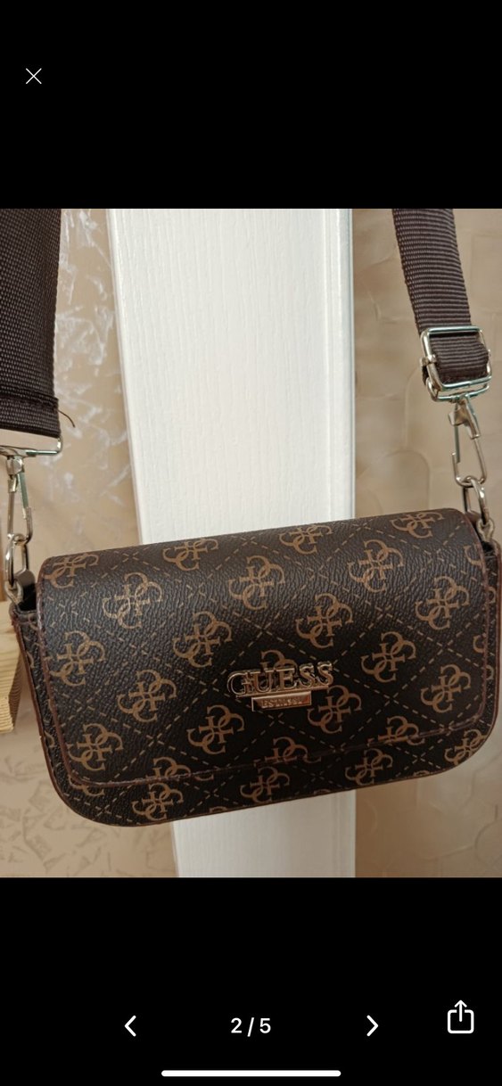 Kahverengi baskılı desene sahip Guess kadın çanta, ayarlanabilir tokalı askı ile. Sentetik kumaştan, günlük sokak stiline uygun yeni aldım ve hiç kullanmadım