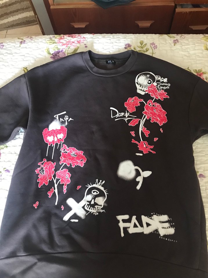 M/L beden uygun Siyah, salaş kesim, baskılı kafatası ve gül desenleriyle, yuvarlak yaka ve kısa kollu sweatshirt. Sokak stili ve "FADE" yazısı yer alır.
