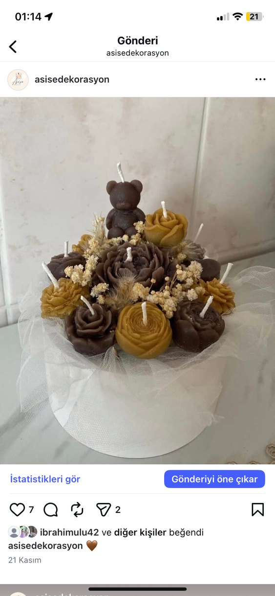 Koyu kahverengi ve hardal sarısı gül ve ayıcık şeklinde mumlar, kuru çiçeklerle beyaz taban üzerinde düzenlenmiştir. ️