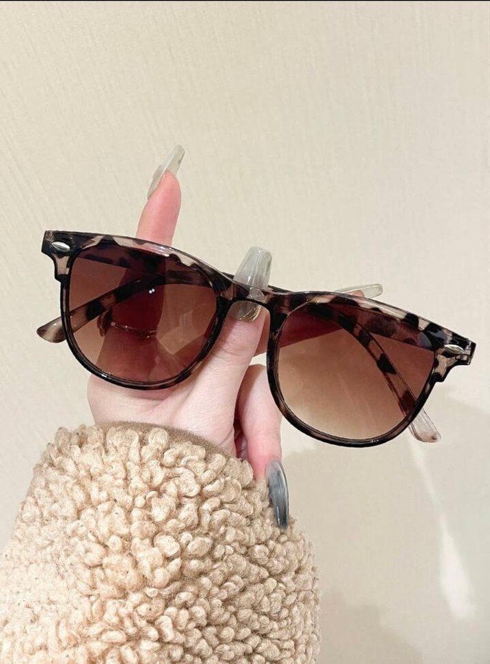 Koyu kahverengi tonlarında, şeffaf detaylara sahip kadın güneş gözlüğü. Ürün paketlidir