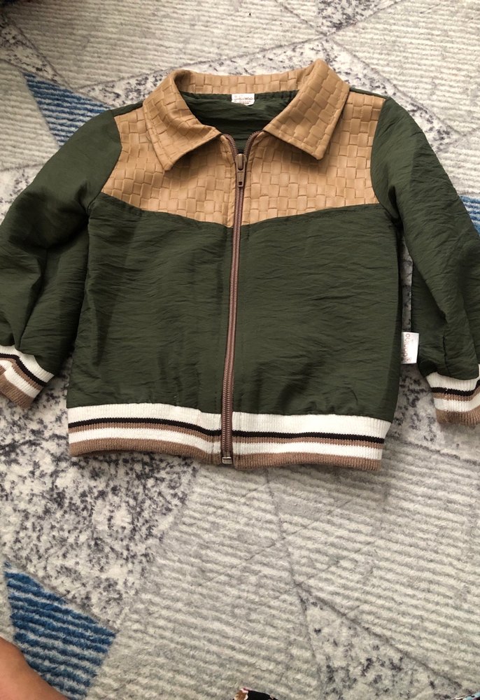 Erkek çocuk ceketi, fermuarlı ve kesimli yakalıdır. Gevşek kesimiyle kahverengi ve koyu haki renkleri birleşir. Yumuşak kumaştan, çizgili ribana manşet ve etek ucu bulunur.